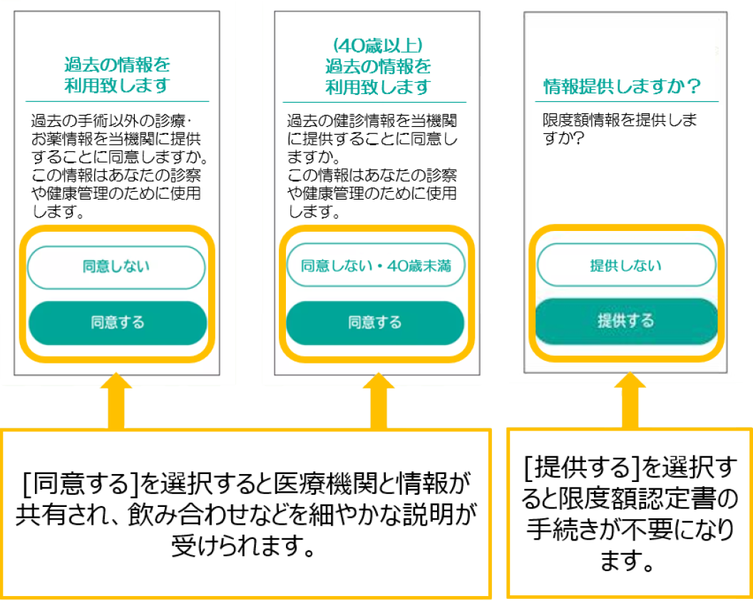 患者様の同意があれば、過去に処方されたお薬情報や特定健診の情報を、薬剤師に共有することができ、より適切な医療が受けられるようになります。